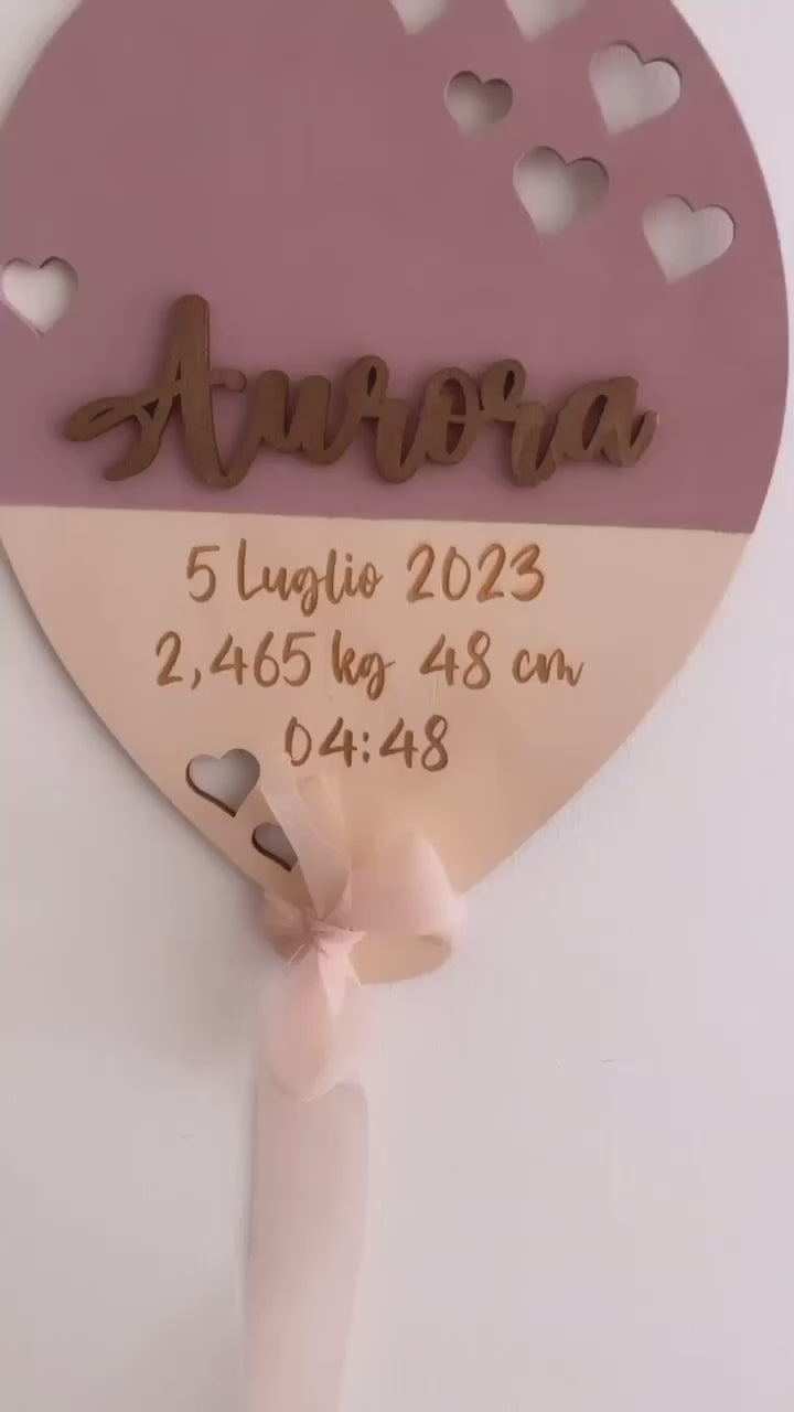 palloncino con incisione dati nascita e nome in rilievo in legno di betulla.